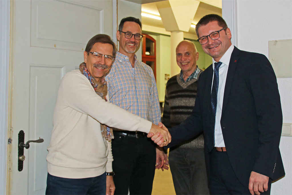 Der Schachclub Asperg hat in der alten Schillerschule, heute ein Haus der Vereine, ein wahrlich passendes Domizil gefunden: Nicht umsonst lautet ein geflügeltes Sprichwort „Schach macht schlau“ – da ist doch die alte Schule der perfekte Ort für eine überaus erfolgreiche Vereins- und Jugendarbeit. Das darüber, dass das Jahrhunderte alte „Spiel der Könige“ auch viel Spaß macht und zum sportlichen Miteinander einlädt, wird beim Besuch unseres Regionalbereichsleiter Thomas Kreissl rasch klar. Mit bester Laune begrüßen ihn (vlnr) Vereinsvorstand Hans-Georg Dunai und Thomas Glaser, Vorstandmitglied und Kassier, sowie der Jugendleiter und Jubiläumsbeauftragte Winfried Bohn: